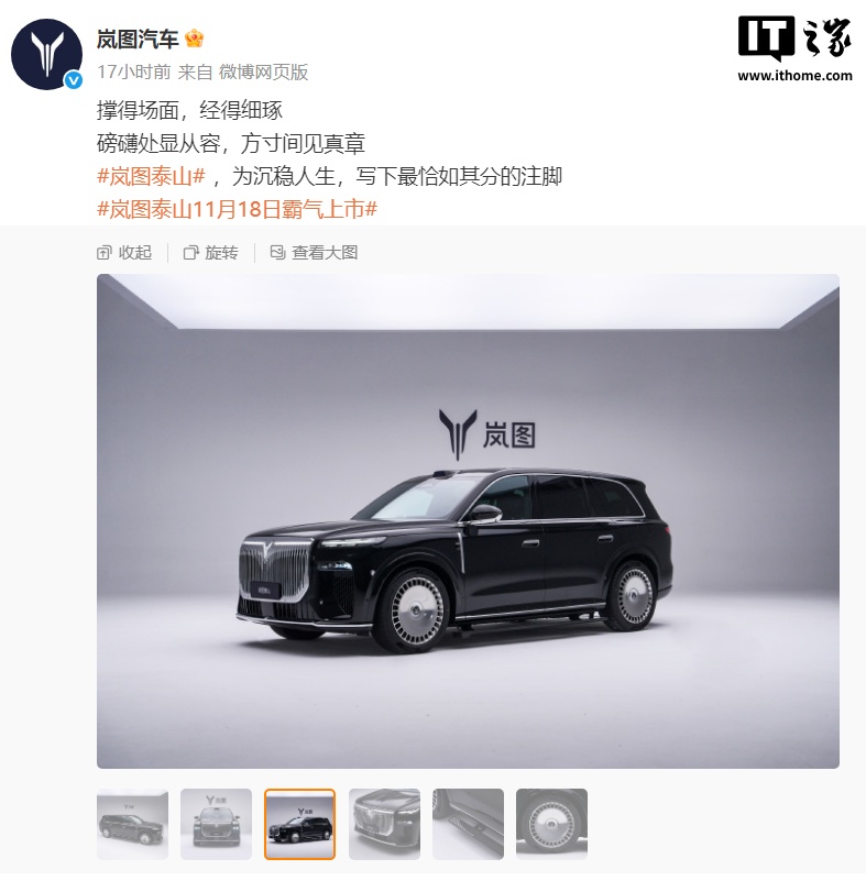 岚图泰山旗舰 SUV 官宣 11 月 18 日上市,搭载华为乾崑智驾 ADS 4、鸿蒙座舱 5 等。