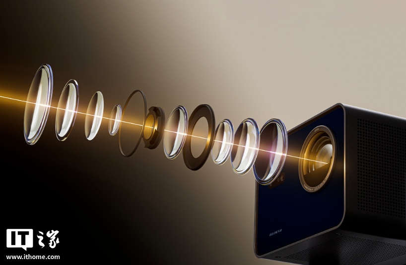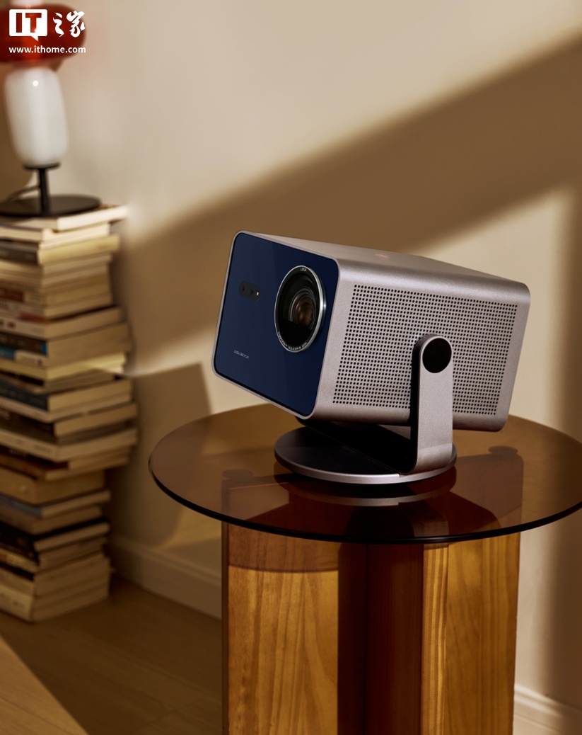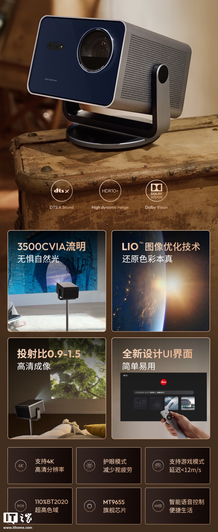 Cine Play 1 Plus 采用全新暮夜蓝配色玻璃前盖 + 铝合金面板,搭载徕卡 Summicron-P 变焦镜头,宣称在 65 至 300 英寸的整个变焦范围内始终保持 4K 分辨率,支持 3500 CVIA 流明亮度、110% BT.2020 色域、投射比 0.9-1.5。
