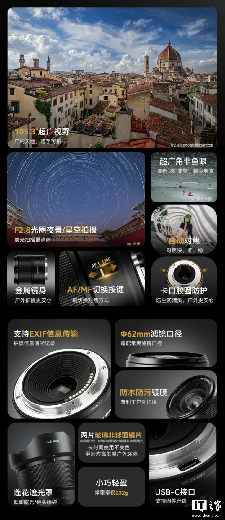 该镜头拥有 105.3° 视场角,宣称接近“零”畸变;采用金属镜身,重量 232g。