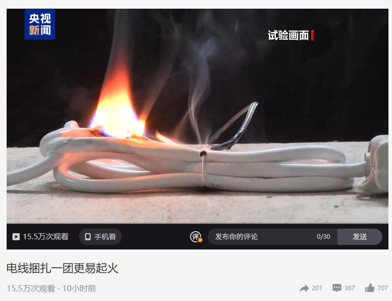 alixixi 11 月 10 日消息,据央视新闻今日报道,消防检查发现在日常电器使用中,许多人习惯将电线捆扎或者缠绕在一起,这可能会导致聚热升温甚至引发火灾。