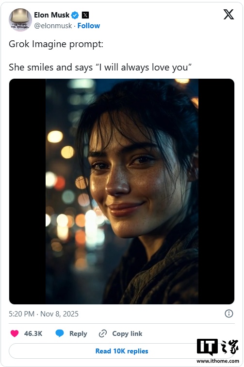美国东部时间周六凌晨 4 点 20 分(这个时间点显然不是巧合)马斯克发布了一段由其公司 xAI 推出的全新图像与视频生成工具 Grok Imagine 制作的视频。据马斯克本人描述,该视频由其输入的提示词生成:“她微笑着说道:‘我将永远爱你。’”视频画面中确有一位动画女性站在雨中的街道上,以明显合成的语音说出这句话。