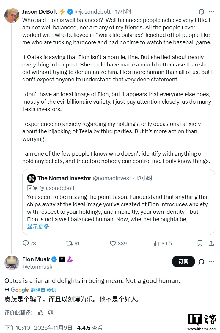 事情起因于一段帖文串:其中一位用户援引并赞赏马斯克对一名批评其薪酬方案的得克萨斯州参议员的回击言论。对此,欧茨回应道:“令人费解的是,马斯克发帖的内容从未体现他享受生活,甚至从未显露出他对绝大多数人所珍视事物的任何认知 —— 无论是朋友、家人、自然、宠物,还是电影、音乐或书籍。”