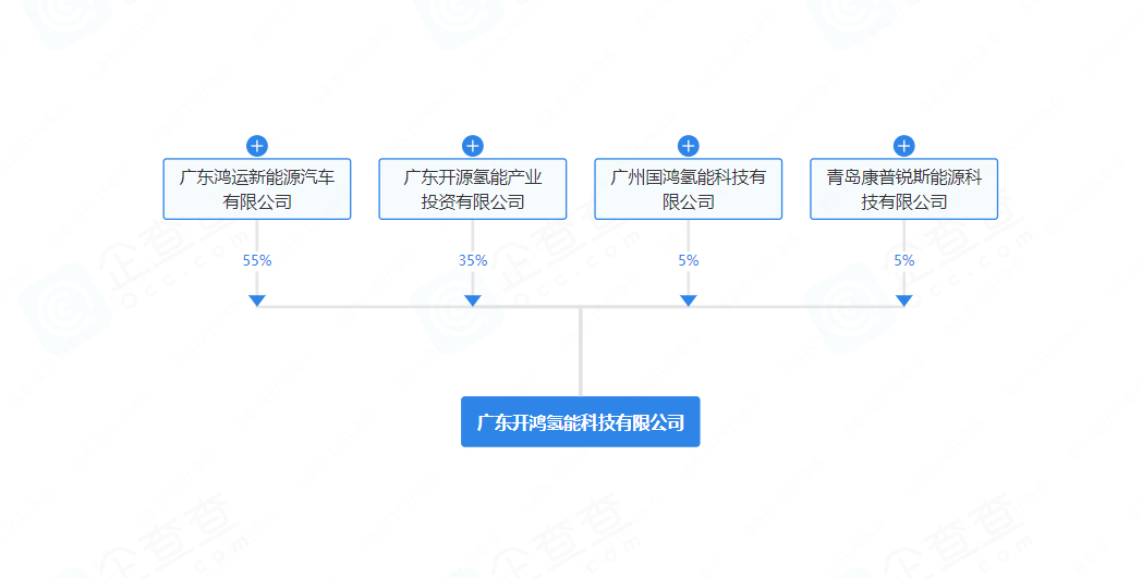 广东鸿运新能源汽车有限公司持股55%,广东开源氢能产业投资有限公司持股35%,广州国鸿氢能科技有限公司持股5%,青岛康普锐斯能源科技有限公司持股5%。