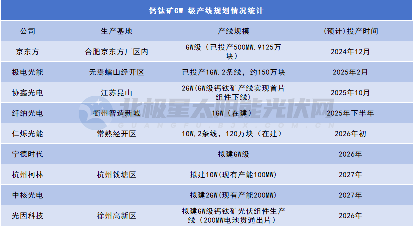 从产业进程看,目前2家企业具备GW级规模,其余多数企业仍停留在百MW级中试阶段。其中,协鑫光电在江苏昆山的GW级产线已于10月29日实现首片2.76m大尺寸组件下线;极电光能在无锡的1GW产线已于2025年2月量产;纤纳光电的1GW产线计划2025年下半年投产。