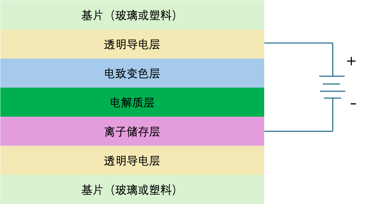 其工作原理为:在电致变色元件两端外加电压,离子在外加电场的作用下,进入电致变色层,导致电致变色材料价数发生变化,即发生氧化还原反应,材料颜色同时相应发生变化,直到价数变化平衡后电致变色材料颜色的稳定。