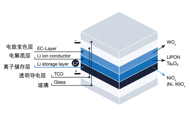 电致变色玻璃一般分为五层,分别是透明导电层、电致变色层、电解质层、离子储存层以及另一层透明导电层。