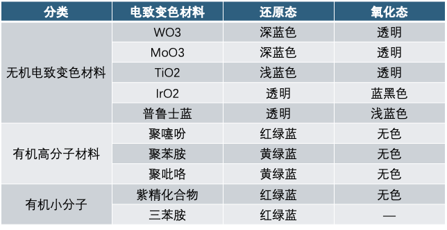 电致变色材料的选择影响其变色效果,目前常用的电致变色材料主要有两类:无机电致变色材料和有机电致变色材料。