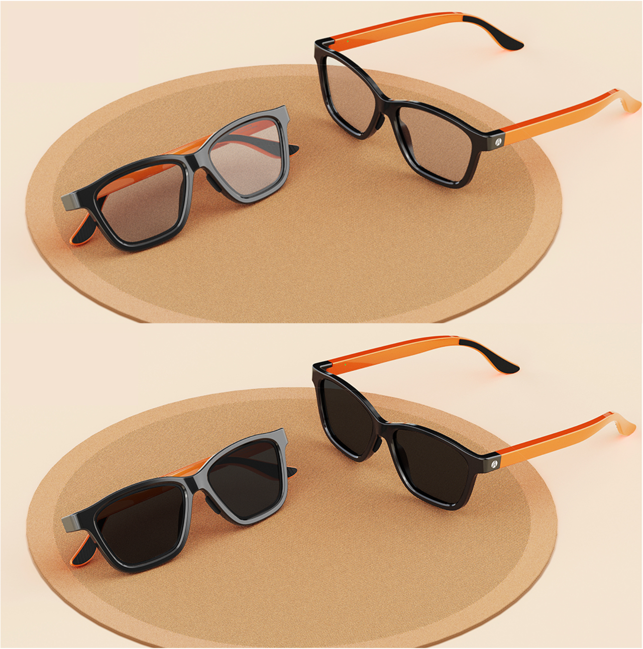 当吸收更多可见光时,镜片颜色加深(着色态),透光率下降;当离子迁出,材料恢复透明状态(透明态),透光率升高。值得注意的是,这个过程是稳定且可逆的。一旦达到所需的颜色/透光率,仅需极少的电能即可维持该状态;反向施加电压,离子就会迁回,镜片恢复透明。