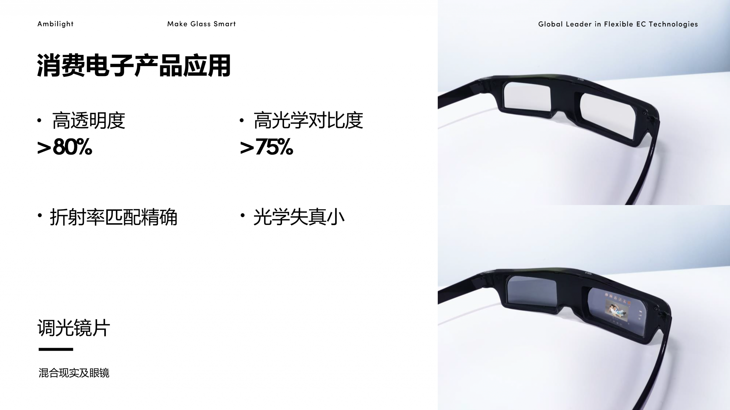 伯宇科技成立于2019年,总部位于苏州,是一家在数控电致变色材料领域具有领先技术的高科技企业,尤其专注于为AR智能眼镜解决关键的光学痛点。其核心技术为无机全固态数控电致变色材料,开发的数控变色镜片可实现主动数控变色,感应强光快速变色等功能,可有效过滤阻挡可见光、红外线光和紫外线光,减少眩光伤害,同时具有防冲击性、抗腐蚀性、防雾、耐磨等特性。镜片符合眼部光学镜片测试标准,无光学畸变,具有高清晰度、易佩戴等优势。伯宇科技已拉通国内首条电致变色镜片生产线。