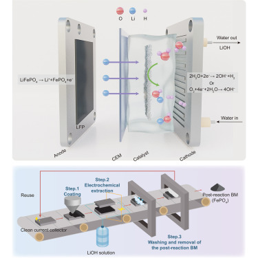 该反应系统的工作原理与电池类似。当电流通过时,锂离子从废弃正极材料(如磷酸铁锂)中释放出来,经由一层阳离子交换膜进入流动的水流。在另一侧电极上,水被分解产生氢氧根离子,随后锂离子与氢氧根在水流中结合,生成高纯度的氢氧化锂,全程无需额外化学药剂。