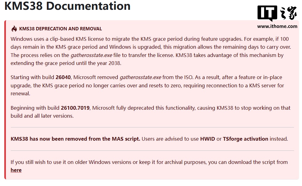 由于该功能已无法在新版本系统中运行,MAS 团队决定在脚本中彻底移除 KMS38 模块,并建议用户改用 HWID 或 TSforge 方式进行激活。