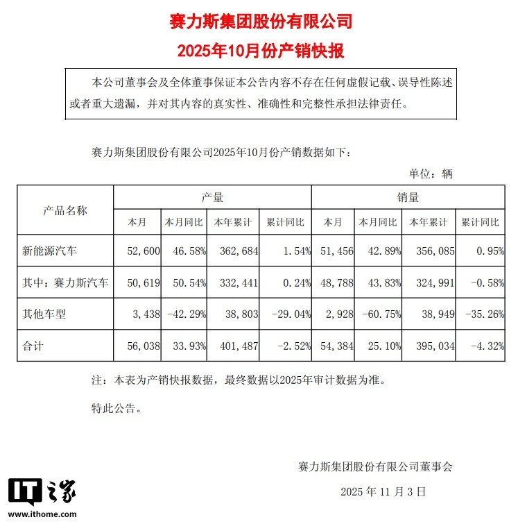 据alixixi了解,在刚刚过去的 10 月,赛力斯集团总产量达 56038 辆,同比增长 33.93%;销量 54384 辆,同比增长 25.10%。赛力斯新能源汽车产量 52600 辆,同比增长 46.58%;销量 51456 辆,同比增长 42.89%。其中,赛力斯(品牌)汽车 10 月产量 50619 辆,同比增长 50.54%;销量 48788 辆,同比增长 43.83%。其他车型产量和销量均出现下滑。