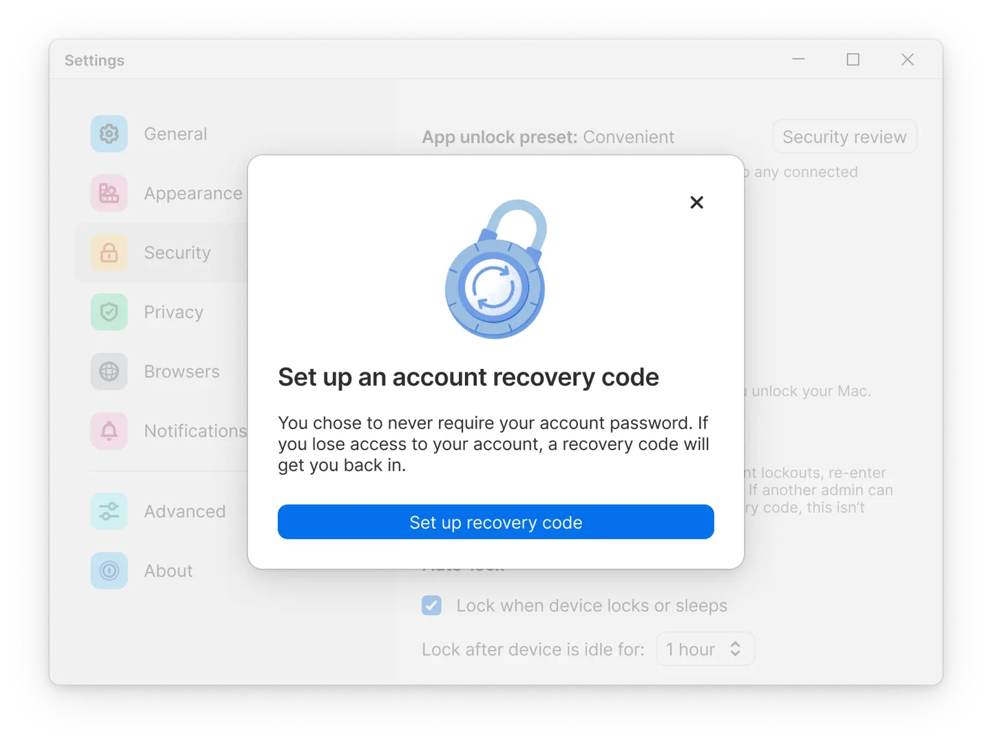 便捷模式:1Password 会与 Mac 设备同步自动锁定和解锁,提供最流畅的体验。
