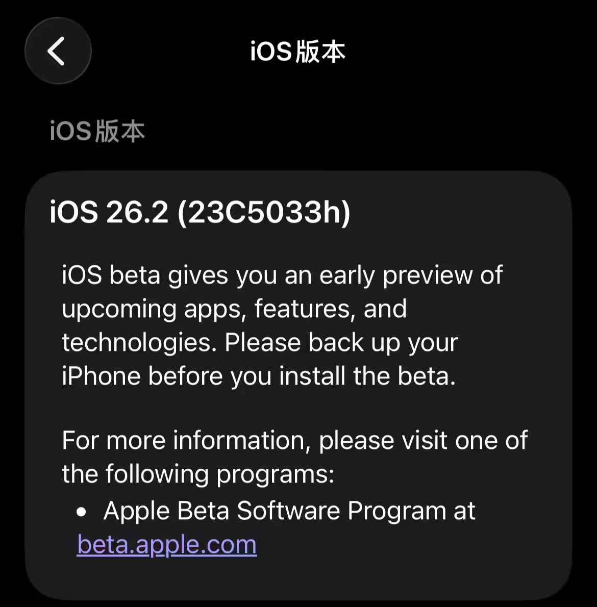 alixixi 11 月 13 日消息,苹果今日向 iPhone 和 iPad 用户推送了 iOS / iPadOS 26.2 开发者预览版 Beta 2 更新(内部版本号:23C5033h),本次更新距离上次发布 Beta / RC 间隔 8 天。