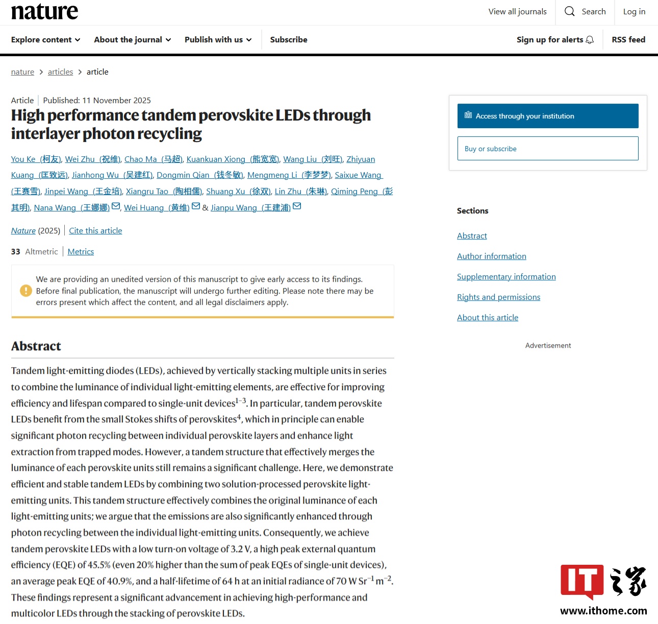 这一突破为开发高性能钙钛矿 LED 开辟了全新的途径。相关研究成果在 11 月 11 日以“High Performance Tandem Perovskite LEDs through Interlayer Photon Recycling”为题,发表于国际顶尖学术期刊《自然》(Nature)。