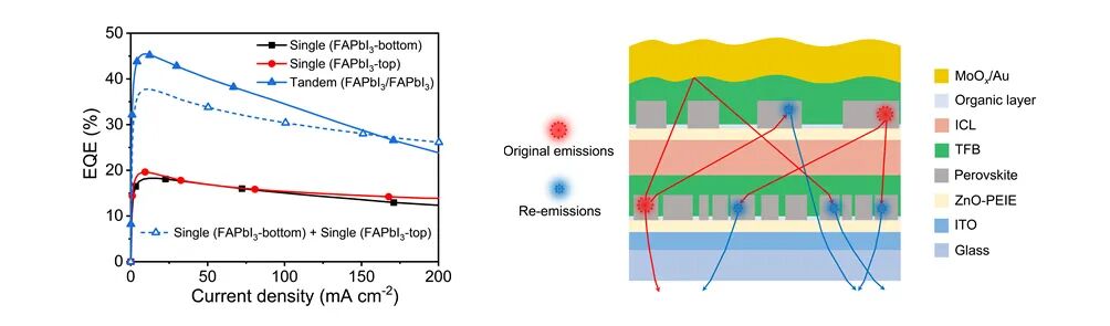 更为重要的是,团队还通过调控钙钛矿发光层的微纳结构,创新性地提出利用叠层器件中独特的层间光子循环效应的策略,即一个发光单元产生的光子可被另一钙钛矿层重新吸收并再次发射,从而突破了传统光提取效率的限制。