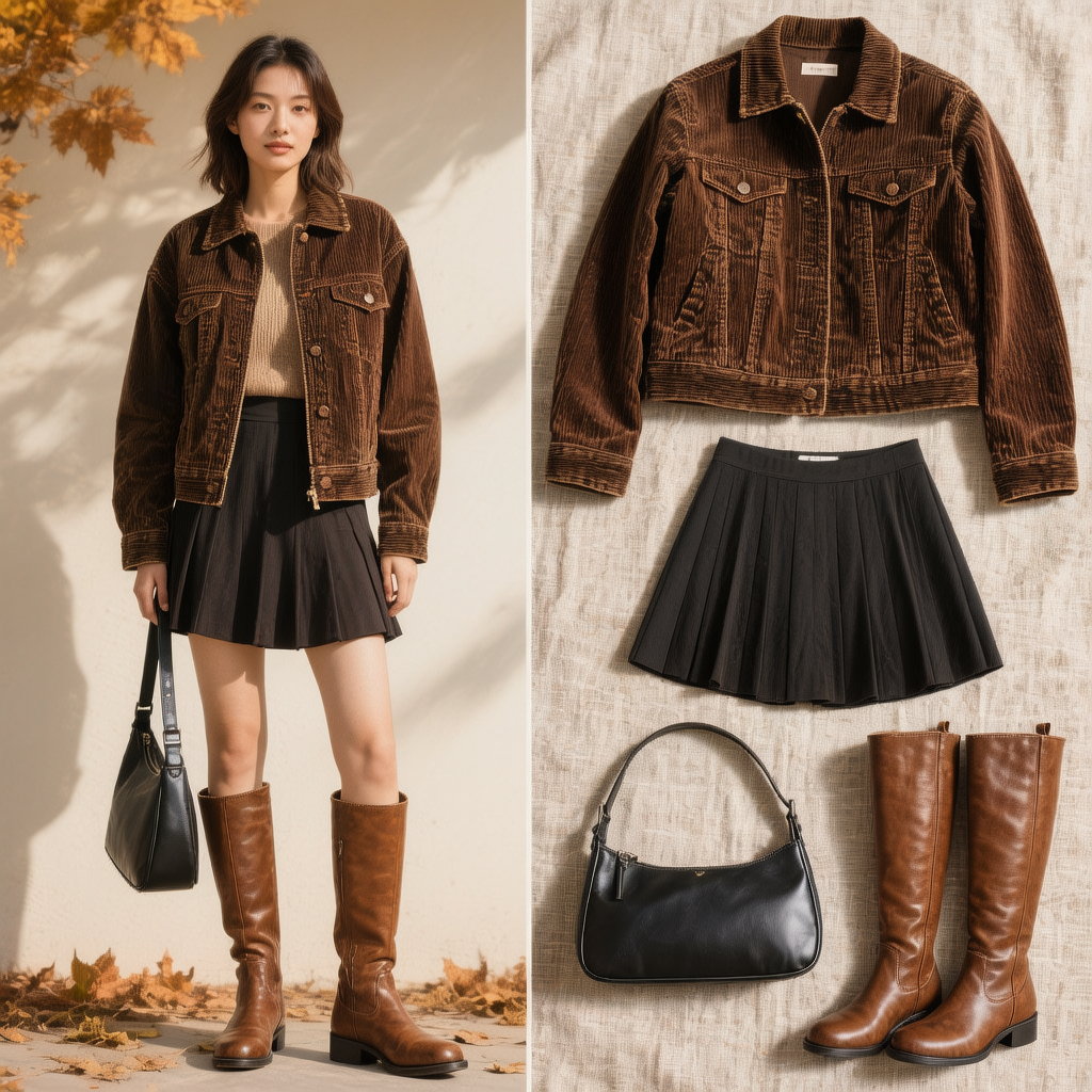 你是一个小红书穿搭博主,请根据模特穿搭生成一张封面图片,要求: 1.画面左侧是模特的 OOTD 全身图;2.右侧是衣服的展示,分别是上衣深棕色夹克、下装黑色百褶短裙、棕色靴子、黑色包包风格:实物摄影,要求真实,有氛围感,秋季美拉德色系穿搭