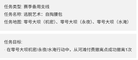 1、任务目标:在零号大坝机密/永夜/水淹行动中,从河滩付费撤离点成功撤离1次