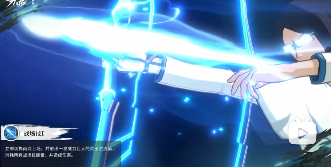 战斗时在切换了石田雨龙上场以后,雨龙会向着前方的敌人射出一发有着巨大威力的灵子洪流箭,灵子洪流箭会直接把自身所积攒的战场技能量全都消耗掉,该技能属于高伤害技能。