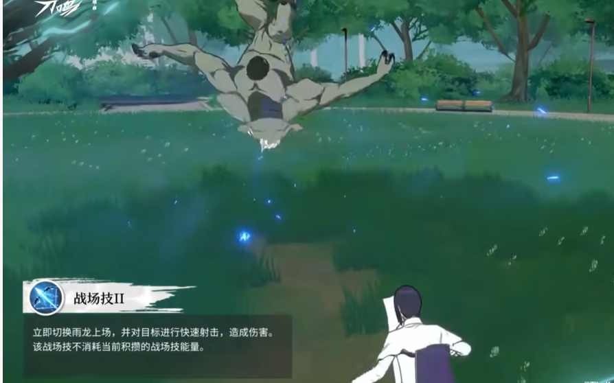用来封灭后,雨龙会直接踩住敌人并且借着敌人的力道向后用力一条,跳到空中会对敌人射出箭矢造成伤害,此外,若是在石田雨龙的战场技生效后使用该技能,技能在命中敌人以后还将会提升雨龙i积攒的战场技能量。