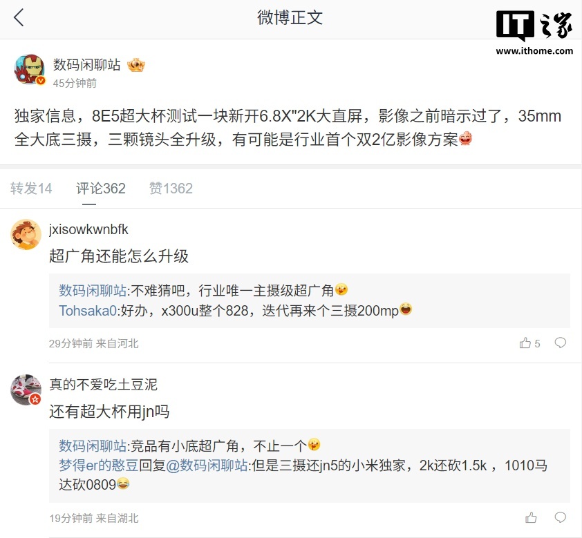 据alixixi此前援引博主消息,某厂的骁龙 8 Elite Gen 5 超大杯新机已新开一块 6.8X"2K 大直屏,搭载 35mm 全大底三摄影像系统,三颗镜头全升级,有可能是行业首个双 2 亿影像方案,预计为 vivo X300 Ultra。