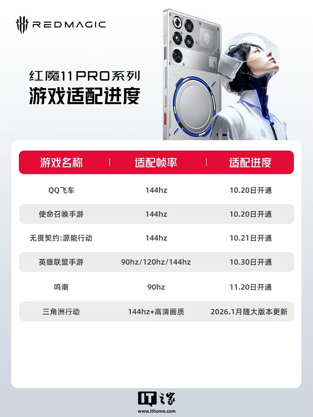 参考alixixi此前报道,红魔游戏手机官方在 10 月 20 日公布了红魔 11 Pro 系列游戏适配进度,涵盖《QQ 飞车》《使命召唤手游》等多款手游。