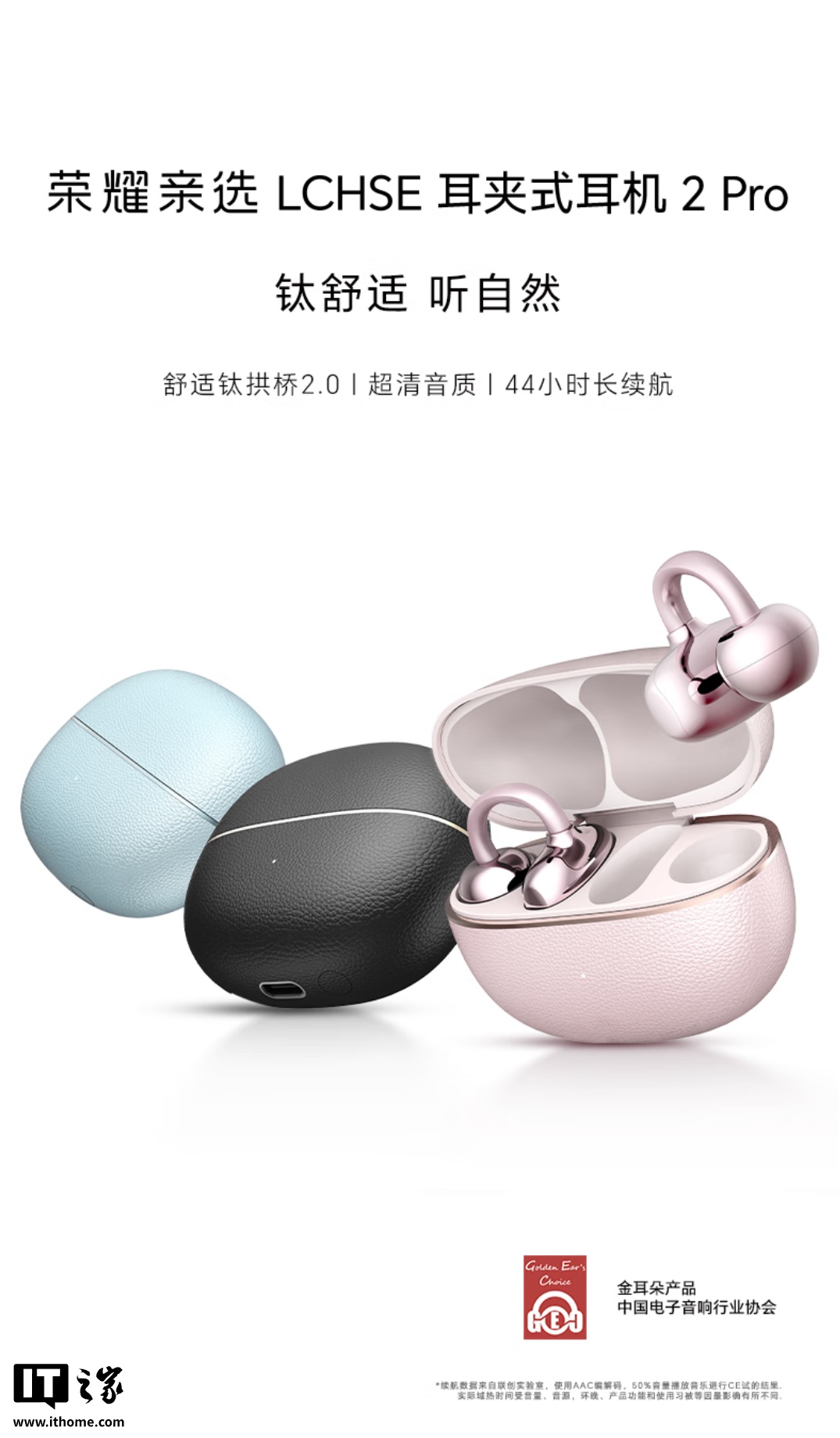alixixi 11 月 13 日消息,荣耀亲选 LCHSE 耳夹式耳机 2 Pro 现已开启新品预约,采用开放式架构设计,内置舒适钛拱桥 2.0,续航可达 44 小时。