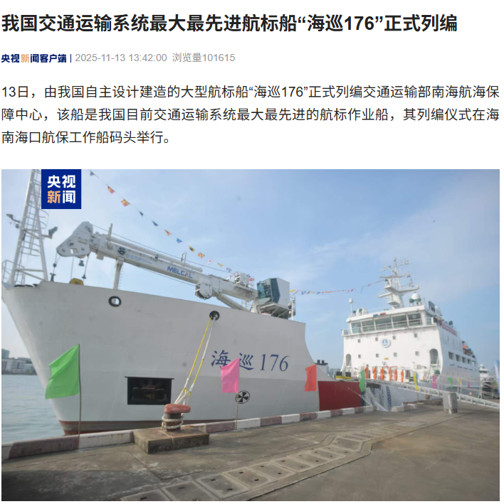 报道提到,“海巡 176”轮列编后,将交付海口航标处管理使用,承担南海海区航标布设、维护保养、导助航管理等任务,重点服务琼州海峡、三沙等水域,提升南海海域航海保障服务能力和水平。得益于新技术、新装备、高效率等优势,“海巡 176”轮将把航标维护保养效率提高 35%,应急处置时效提升 15%。