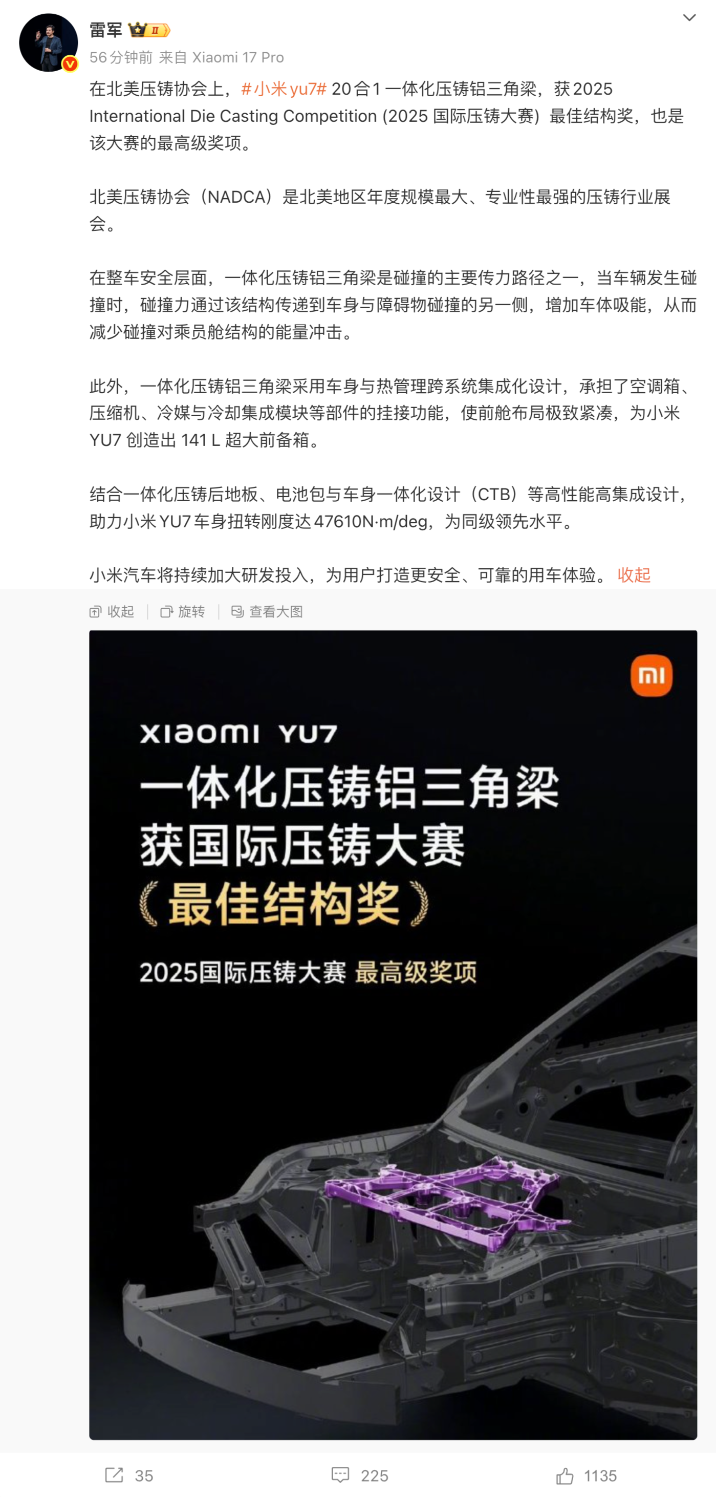 alixixi 11 月 13 日消息,今天下午,小米创办人、董事长兼 CEO 雷军通过微博发文宣布:在北美压铸协会上,小米 YU7 凭借 20 合 1 一体化压铸铝三角梁,获 2025 International Die Casting Competition (2025 国际压铸大赛)最佳结构奖,也是该大赛的最高级奖项。