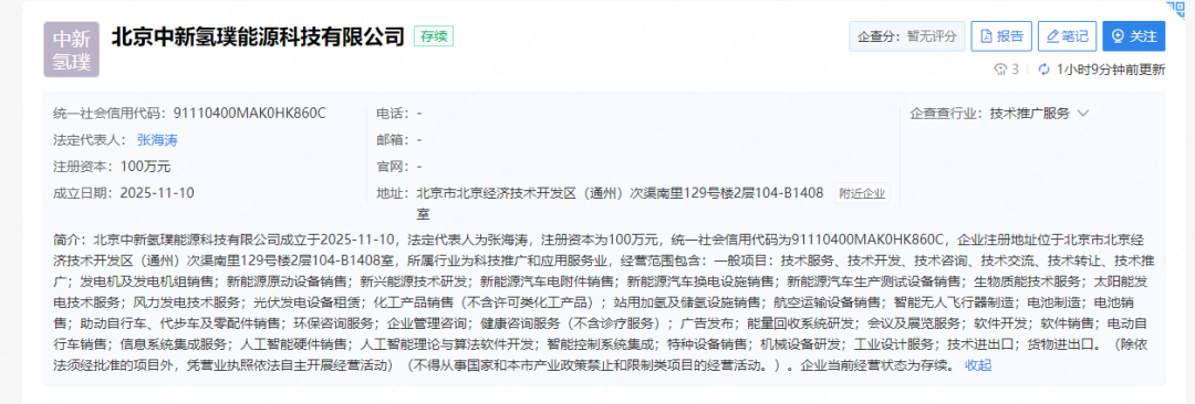 据企查查显示,近日,北京中新氢璞能源科技有限公司成立,注册资本100万元,法定代表人张海涛。