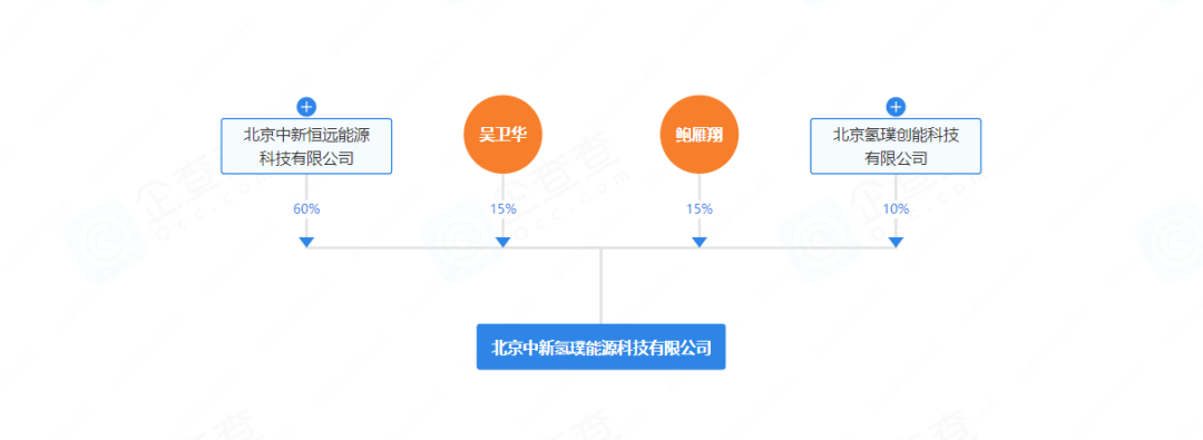 股东信息显示,该公司由北京中新恒远能源科技有限公司(持股60%)、吴卫华(持股15%)、鲍雁翔(持股15%)、北京氢璞创能科技有限公司(持股10%)共同持股。