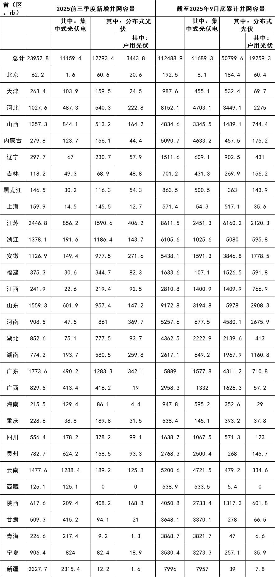 2025年前三季度集中式光伏电站装机11159.4万千瓦,前十的省份分别为:新疆、云南、江苏、山西、宁夏、贵州、山东、广东、河北、甘肃。