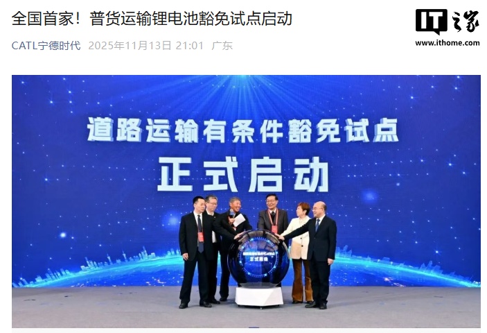 alixixi 11 月 14 日消息,据宁德时代官方,11 月 13 日,“交通强国试点 — 构建动力锂电池安全高效物流通道”道路运输有条件豁免试点启动仪式在四川宜宾举行。宁德时代成为全国首家获得道路运输有条件豁免的试点企业,实现动力及储能锂电池从“特种监管”到“安全豁免”的关键跨越,标志着我国新能源产业基础设施配套步入新阶段。