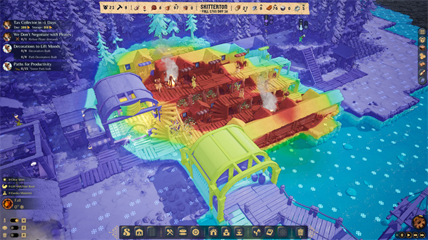 使用快捷键 H,你可以切换热量覆盖层,以了解殖民地中哪些区域温暖或寒冷。提供篝火可以让你的‘胡须族’保持温暖。然而,篝火最终会烧光木材,因此你需要定期重建它们。