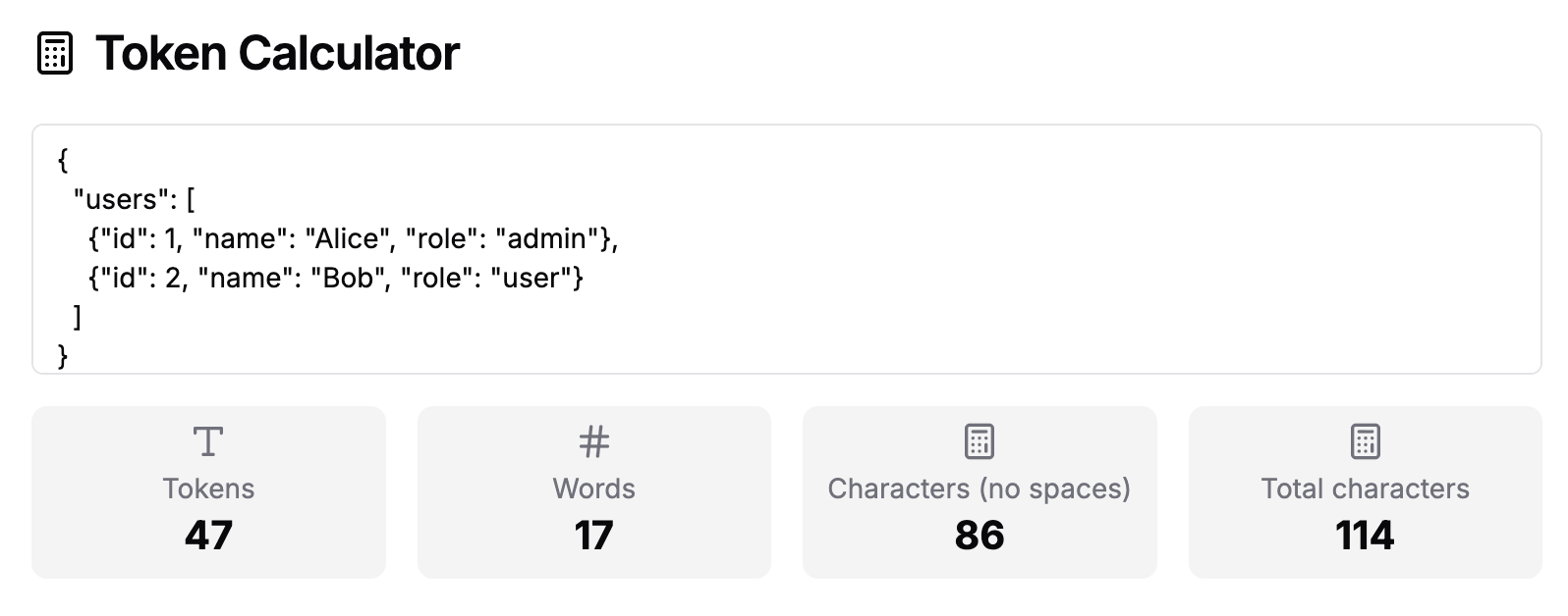 差异的核心在于:TOON 用“缩进 + 一次性字段声明”的方式消除了绝大部分语法标点的冗余;当你在生产环境每天传输成千上万条记录时,冗余标点的累计开销会直接转化为可观的 API 费用。实践表明,TOON 在输入侧常带来 40–60% 的 token 节省。