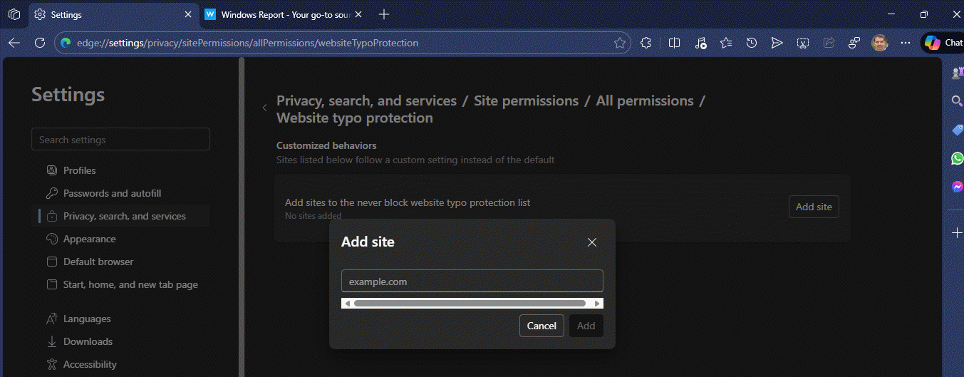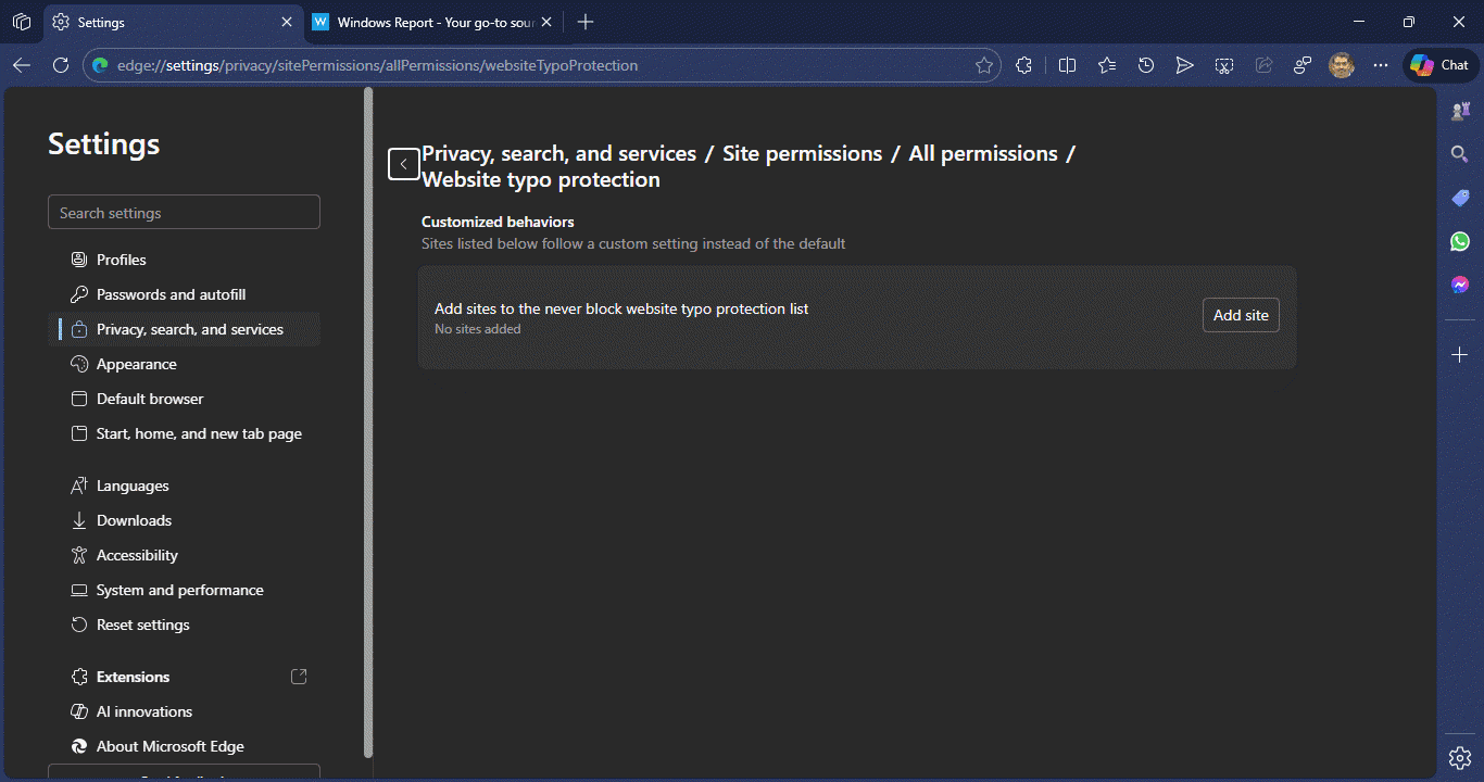 alixixi 11 月 14 日消息,据科技媒体 Windows Report 今天报道,微软正在为 Edge 浏览器测试一项新功能,可让用户将自己信任的网站或域名忽略拼写错误警告。