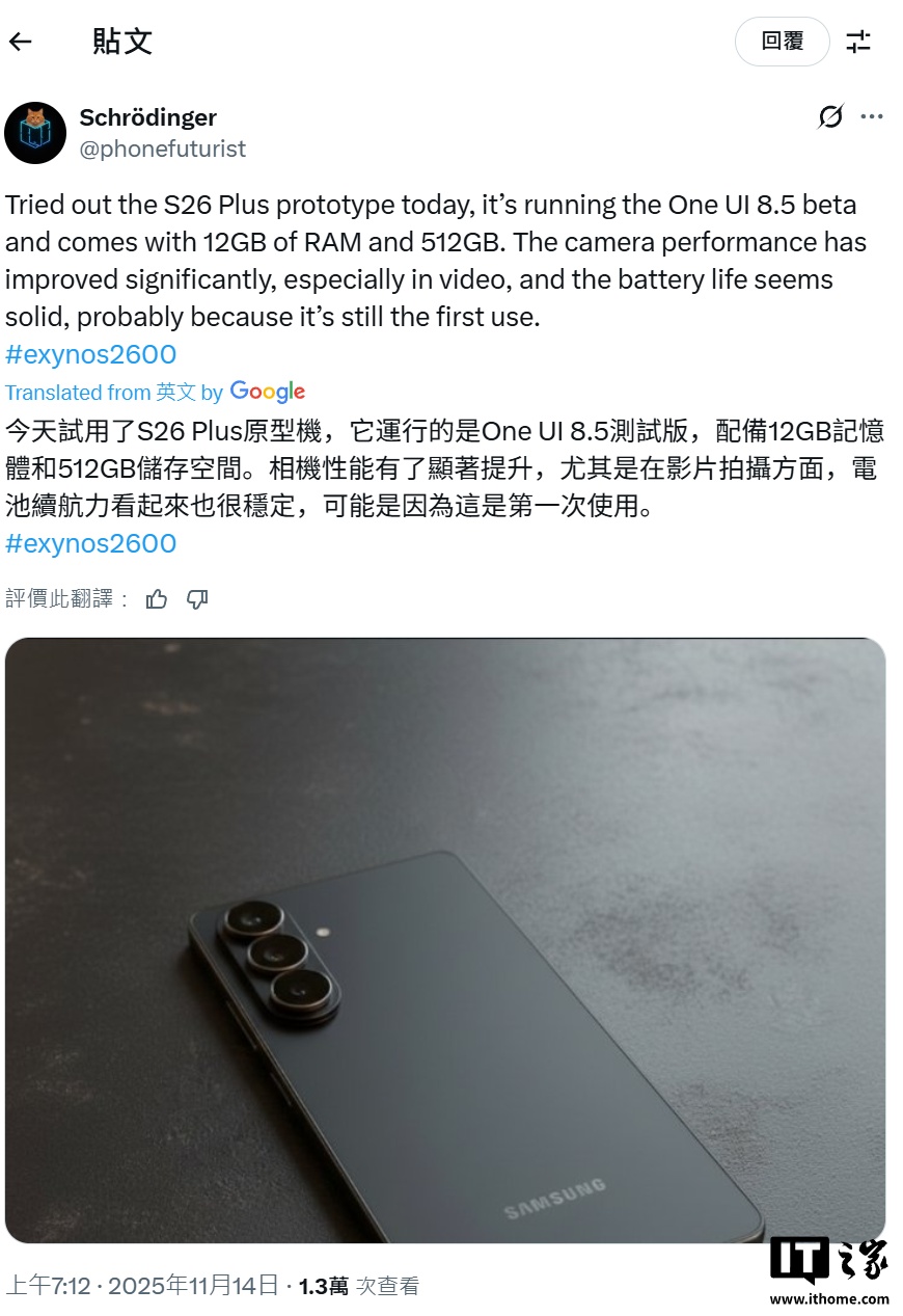 alixixi 11 月 14 日消息,消息人士 Schrödinger 今天在 X 平台发文,曝光三星 Galaxy S26+ 手机的实拍图及软硬件参数。