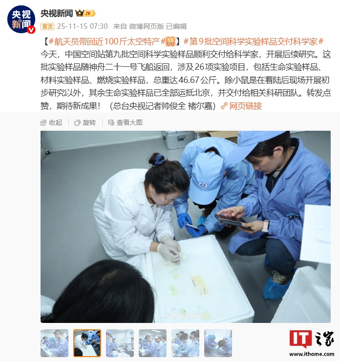 据央视新闻今日报道,中国空间站第九批空间科学实验样品已于今日顺利交付给科学家,开展后续研究。这些实验样品已于昨天随神舟二十一号飞船顺利返回,涉及 26 项实验项目,包括生命实验样品、材料实验样品、燃烧实验样品,含实验小鼠等在内的实验样品总重达 46.67 公斤。