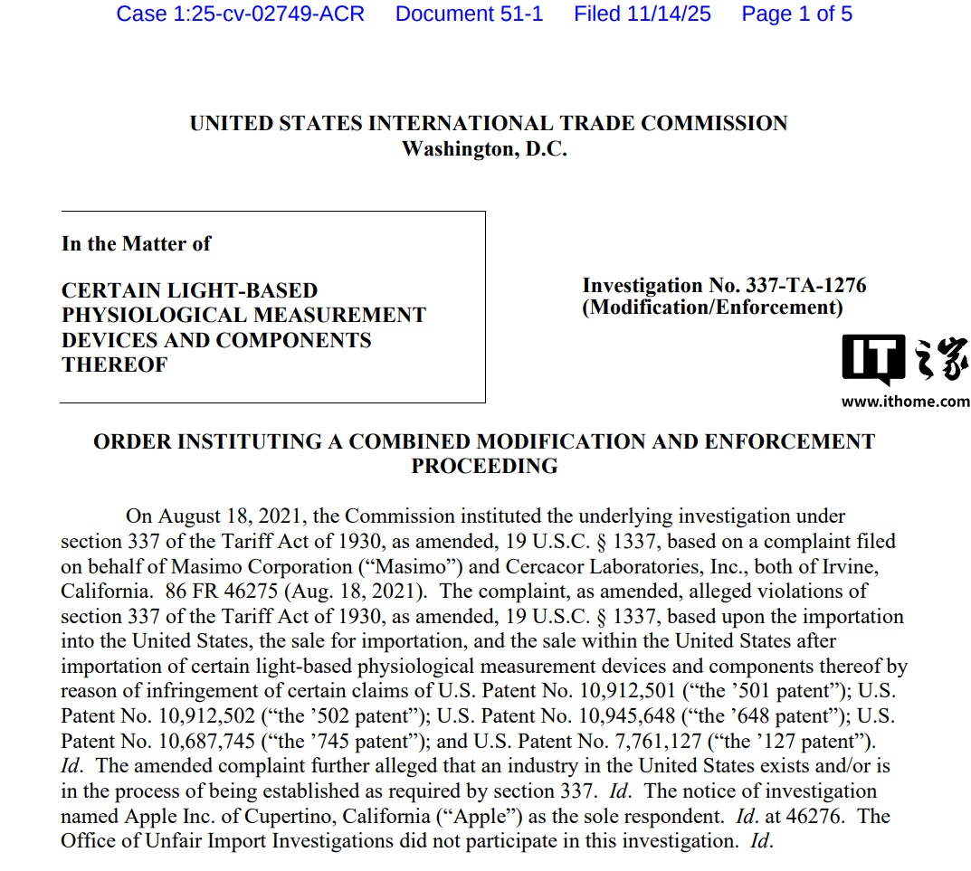 然而,这一“曲线救国”的方案如今再遇挑战,美国国际贸易委员会(ITC)已宣布启动一项新的合并修改与强制执行程序,以审查苹果的新方案是否仍在 Masimo 专利的限制范围之内。