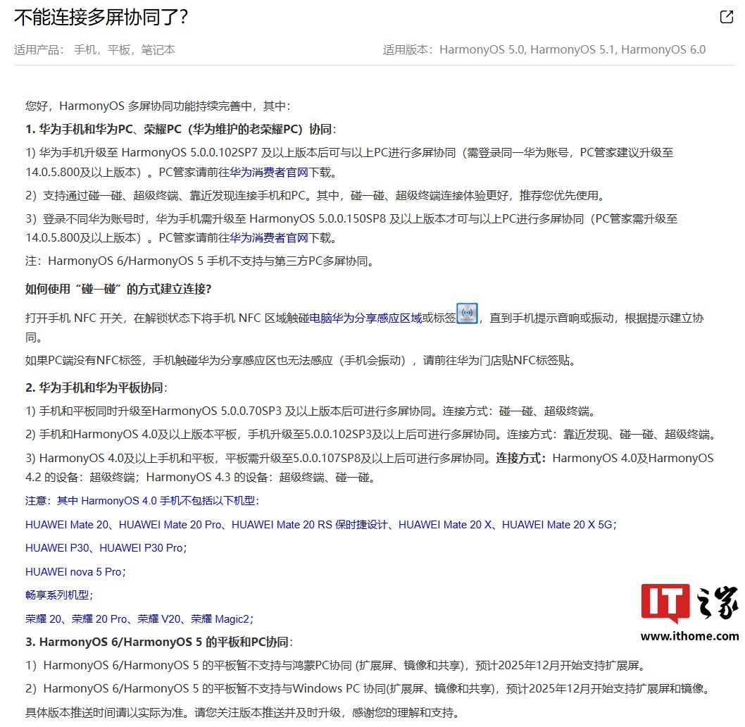 博主此次爆料内容具有一定参考性。参考alixixi此前报道,华为官网显示,鸿蒙 HarmonyOS 6 / HarmonyOS 5 的平板和 PC 多屏协同功能预计在今年 12 月回归: