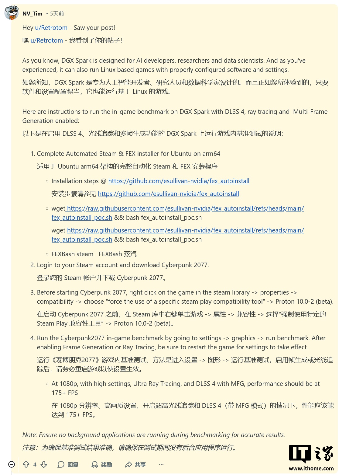 情况的转机源于英伟达官方人员在社区发布的一份新配置指南。该指南详细说明了如何通过配置特定的兼容性工具(如 Proton 10.0-2)和软件,让 DGX Spark 正确识别并启用 DLSS 4、多帧生成乃至要求最高的路径追踪(Path Tracing)功能。这一突破彻底释放了 GB10 芯片内置 GPU 的图形处理能力。