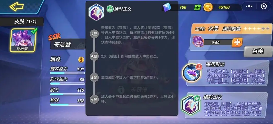 还有一点也很有意思,就是寄居蟹的被动技能【绝对正义】。它解锁了之后,三次普攻就能让敌人中毒,敌人中了毒之后会变得很慢,而且会失去一些血量,这样就能给对手带来很大的麻烦。到了四星,效果会更强,普攻两下就能让敌人中毒。虽然你可能会遇到一些高手,他们跳跃和冲刺都很厉害,可能就不容易让你触发这个技能,但还是可以找机会去使用,像敌人扣篮之后,刚落地的时候会有一点点的空隙,这时候你就可以趁机普攻,给敌人中毒,再找机会进攻。