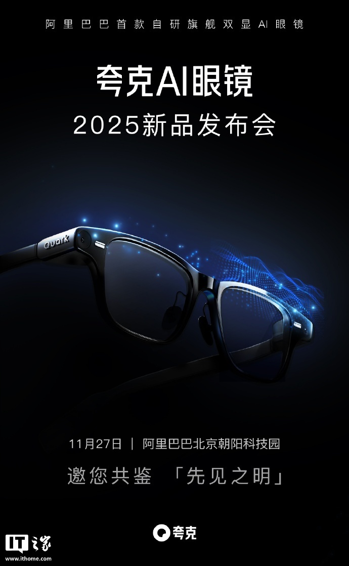 《阿里首款自研 AI 眼镜:夸克 AI 眼镜定档 11 月 27 日发布,镜腿可换电设计、支持拍摄 POV 视频》