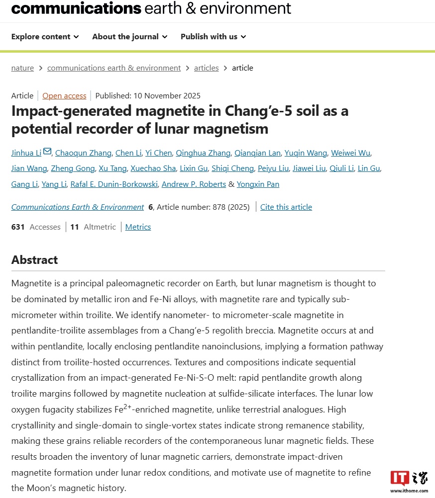 alixixi 11 月 15 日消息,据中国科学院地质与地球物理研究所官方公众号昨日分享,近期,该所李金华研究员牵头的中外团队,采用“显微学-同步辐射-微磁学”的多技术关联手段,在嫦娥五号月壤中识别出一类撞击成因的磁铁矿(Fe₃O₄)。