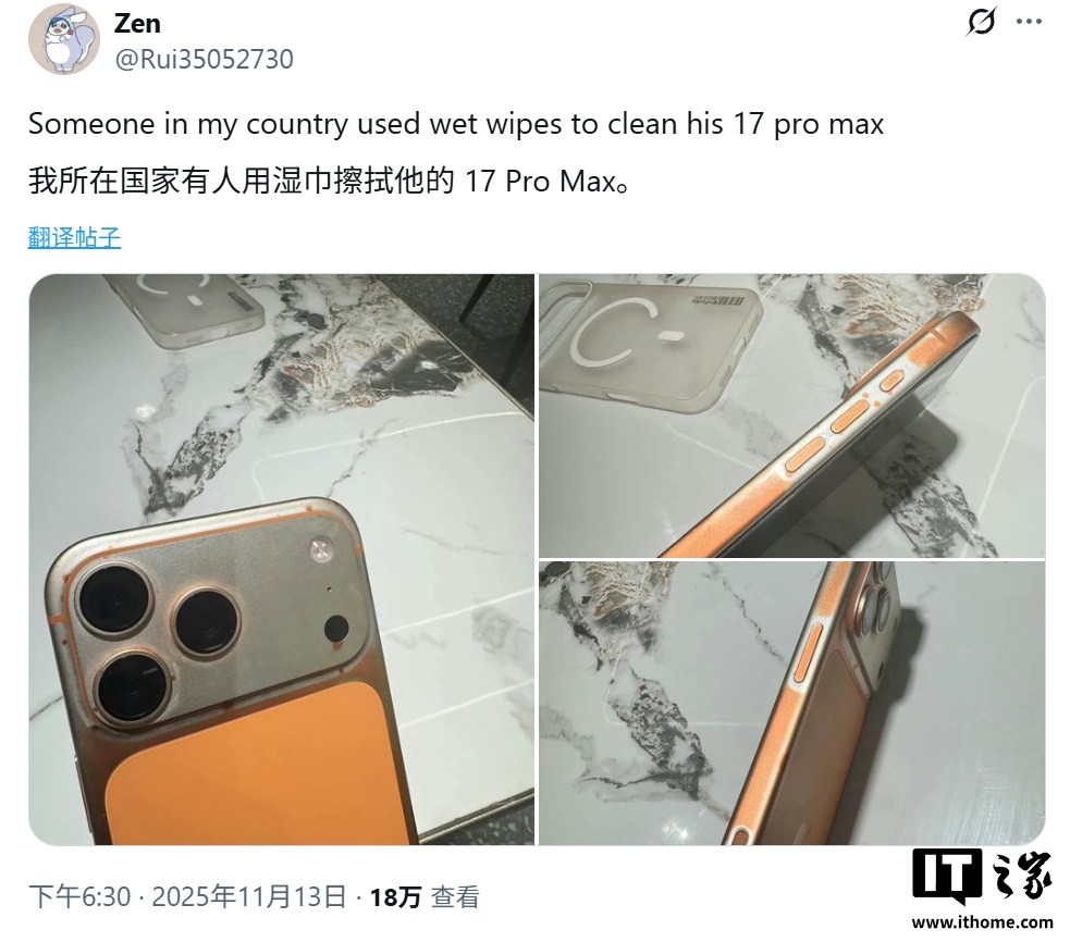 alixixi 11 月 16 日消息,网友 @Rui35052730 于 11 月 13 日在 X 平台发布推文,分享了 3 张照片,称星宇橙 iPhone 17 Pro Max 在使用湿巾清洁后,机身涂层被擦除。