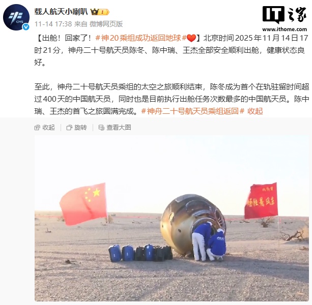 北京时间 2025 年 11 月 14 日 16 时 40 分,神舟二十一号载人飞船返回舱在东风着陆场成功着陆。神舟二十号乘组 3 名航天员在轨驻留 204 天,刷新了中国航天员单个乘组在轨驻留时间最长纪录,期间完成了 4 次出舱活动和多次货物进出舱任务,在地面科研人员密切配合下,完成了涉及微重力基础物理、空间材料科学、空间生命科学、航天医学、航天技术等领域的大量空间科学实(试)验。