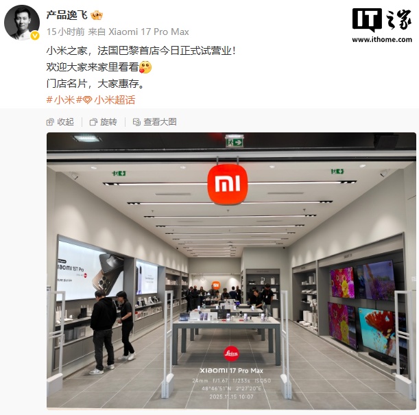 alixixi 11 月 16 日消息,小米法国副国家经理 @产品逸飞 昨日发文宣布小米之家法国巴黎首店正式试营业,并分享门店照片。