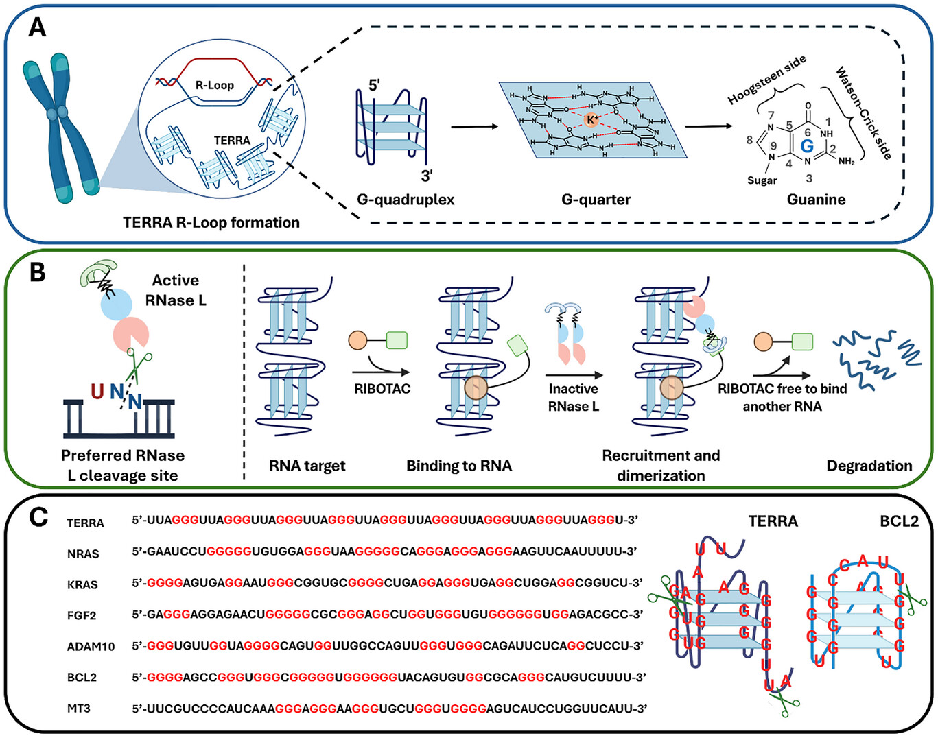 研究团队利用 RIBOTAC(Ribonuclease-Targeting Chimera)技术构建了这一小分子。该技术可识别 TERRA 独特的 G-四链体结构,并招募细胞内的天然酶 RNase L 将其切割。这是科学家首次能够如此精确地摧毁 TERRA。实验显示,这种小分子仅针对 TERRA,不会影响其他结构相似的 RNA。