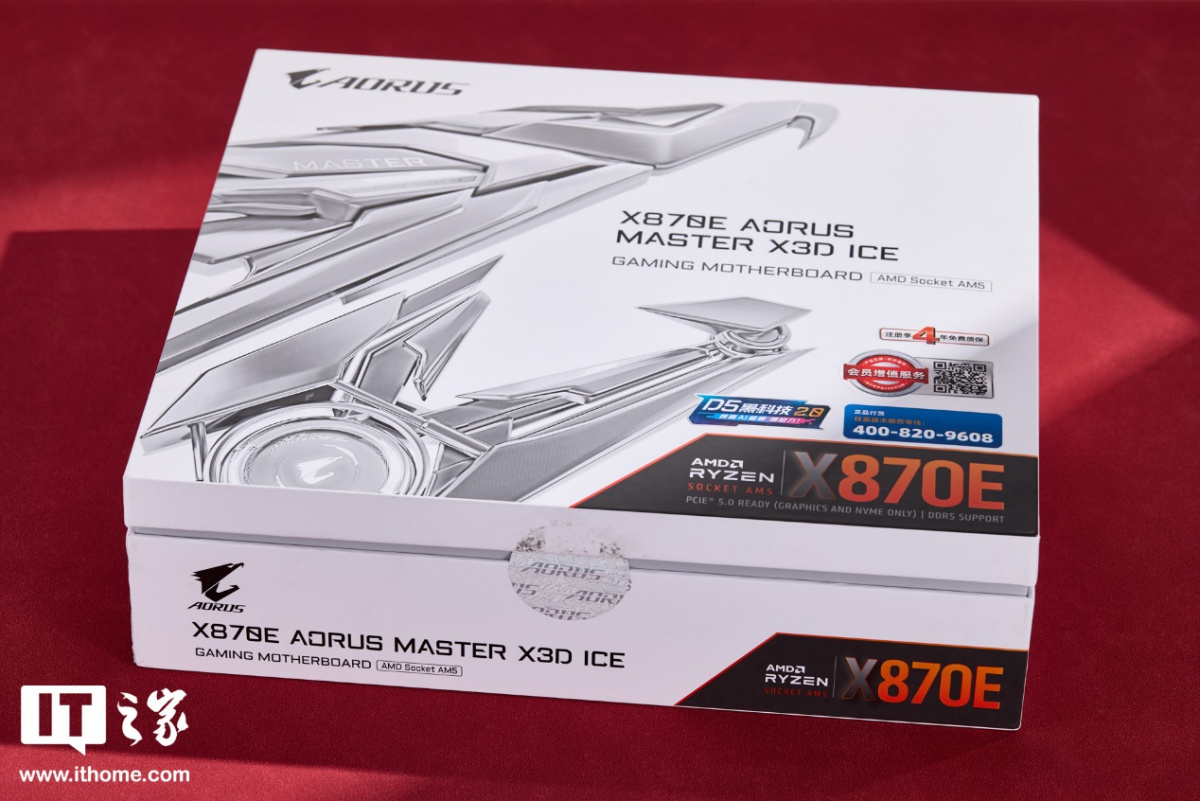 alixixi已经拿到了这款旗舰定位的主板新品,接下来就给大家带来开箱图赏。技嘉超级冰雕 X870E X3D 主板采用定制白色天地盖包装,包装正面印有金属质感的大雕图案,X870E 型号、D5 内存黑科技 2.0 核心卖点以及 4 年保修服务相关信息。