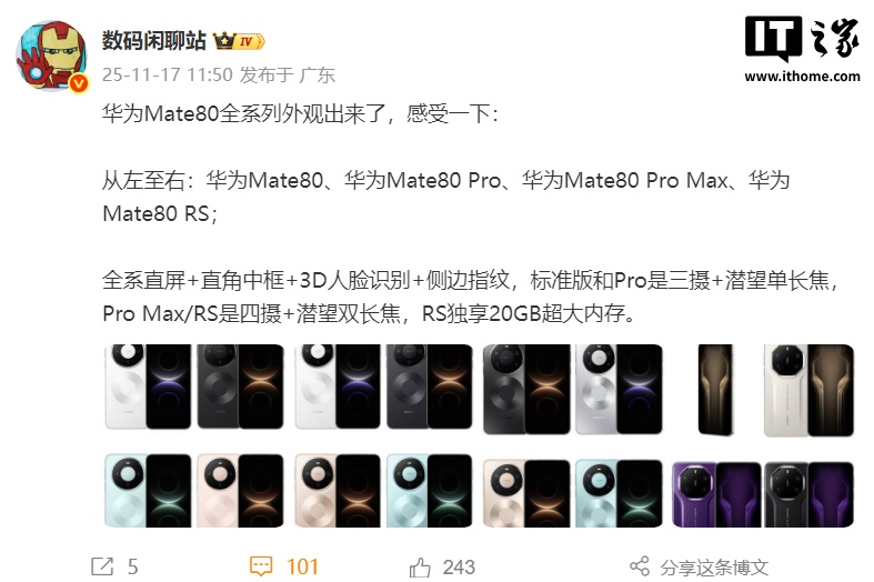 博主 @数码闲聊站 表示,华为 Mate 80 系列全系直屏 + 直角中框 +3D 人脸识别 + 侧边指纹,标准版和 Pro 是三摄 + 潜望单长焦,Pro Max / RS 是四摄 + 潜望双长焦,RS 独享 20GB 超大内存。